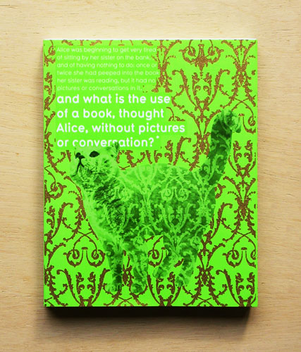 Individual bookdesigns (this featuring the first line of Carol's "Alice in Wonderland") in series of sample volumes that showcases various bindings and cover folds. This example: English Brochure.