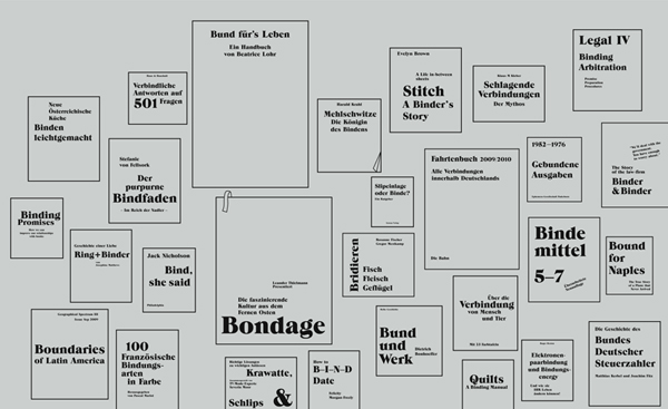 This interior design features a wealth of fictional book-covers. All the titles contain "bind"-related phrases or words in great variety and diverse meanings.