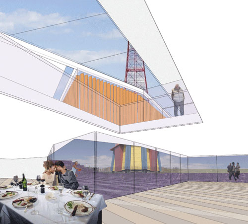 This proposal for a new pavilion, which would feature not only restaurants, office space, shop, tourist centre, and gallery, but also an open civic space, incorporates the dynamic and analogue technology of commercial billboards to display various cultural information flexibly. Situated right next to the famous Parachute Jump Tower and the Coney Island Broadwalk, it would playfully reflect and update the commercial and entertainment heritage of the site.