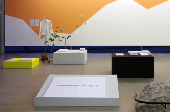 This graphic scenario does not propose an exhibition, but a set. Against the backdrop of an optimistic, post-ironical landscape, its panorama is the stylised silhouette of the exchange rate of the European joint currency to the U.S. Dollar since its introduction. Along with this, props for publishing are laid out in front of the visitor. The visual representation of data is the graphic success story of the last 10 years. Its origins can be seen in the 18th century when William Playfair took the first serious steps towards the visualisation of quantifiable data that was not just based on geographical information. In today's world info-graphics are the dynamic and amusing mediators of complex facts and their connections. If we want to articulate and negotiate a single or a multitude of ideas of Europe, we are inevitably entangled in the interpretational multiplicity of signs and symbols and their subsequent ambivalences. As the symbol for sums, the Greek capital letter Sigma describes a sequence of numbers - commonly represented by the index "i" and limited by the variable "n" - which are added up. The character Sigma can, however, depending on the scientific field, describe entirely different functions and operations. It has represented the numeric value of 200 in Ancient Greece and can also stand for a signature or a reference system or even an alphabet.