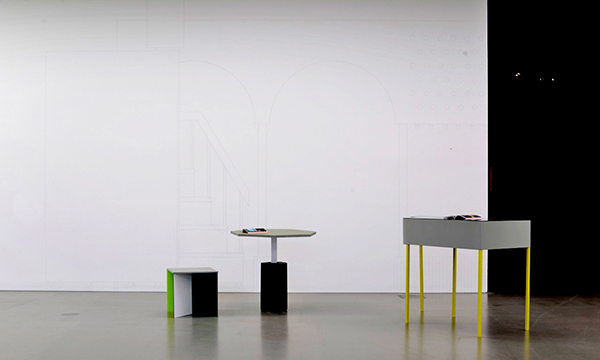 In reference to our architectural changes to the college courtyard, we created here an interior situation with an to-scale pencil wall-drawing of pavilion and mobile staircase, and three objects. A stool with differently coloured underside plywood and perspex panels. A table with a seven-corner table-top with a cast-concrete foot. A high table with a piano-reference. Together they form an ensemble, a scene, which provides an environment for reading our book "THE VISUAL EVENT".