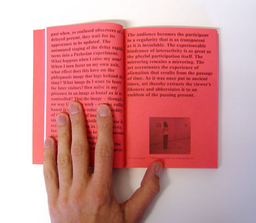 The design of this polemic assessment of key pieces interaction art on their true level of interactivity is a ironic nod towards the ratified medium of the book, as brick. Printed on coloured stock throughout, apart from an initial essay and an image section in the middle, it features ambivalent quasi scientific charts which portrait the art pieces in an assessed and recorded format.